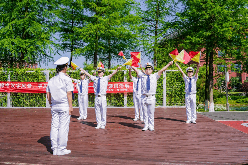 半军事化管理的学员们也在现场为大家带来了精彩的旗语操和队列训练表演。他们以整齐一致的队列入场,动作刚劲有力。现场同学还受邀加入短训,在队列姿势和旗语操的训练中体会海运人的团队精神和纪律性。