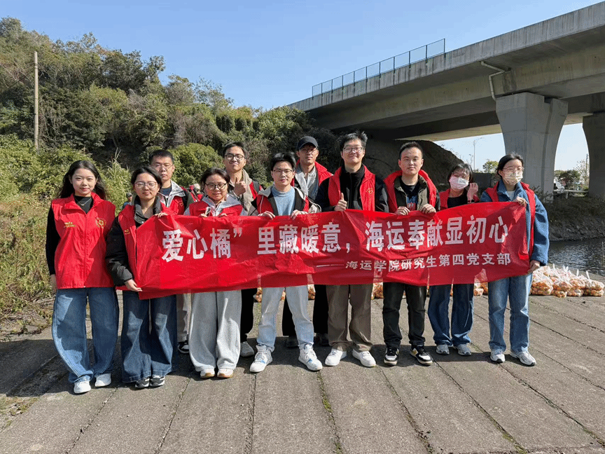 11月25日,疯av 研究生第四党支部的党员与积极分子们身着红色志愿马甲,带着防滑梯、剪刀、塑料袋等工具,踏着晨光奔赴北仑春晓昆亭村郑美凤阿姨的橘园,践行“‘爱心橘’里藏暖意,海运奉献显初心”的主题党日活动。