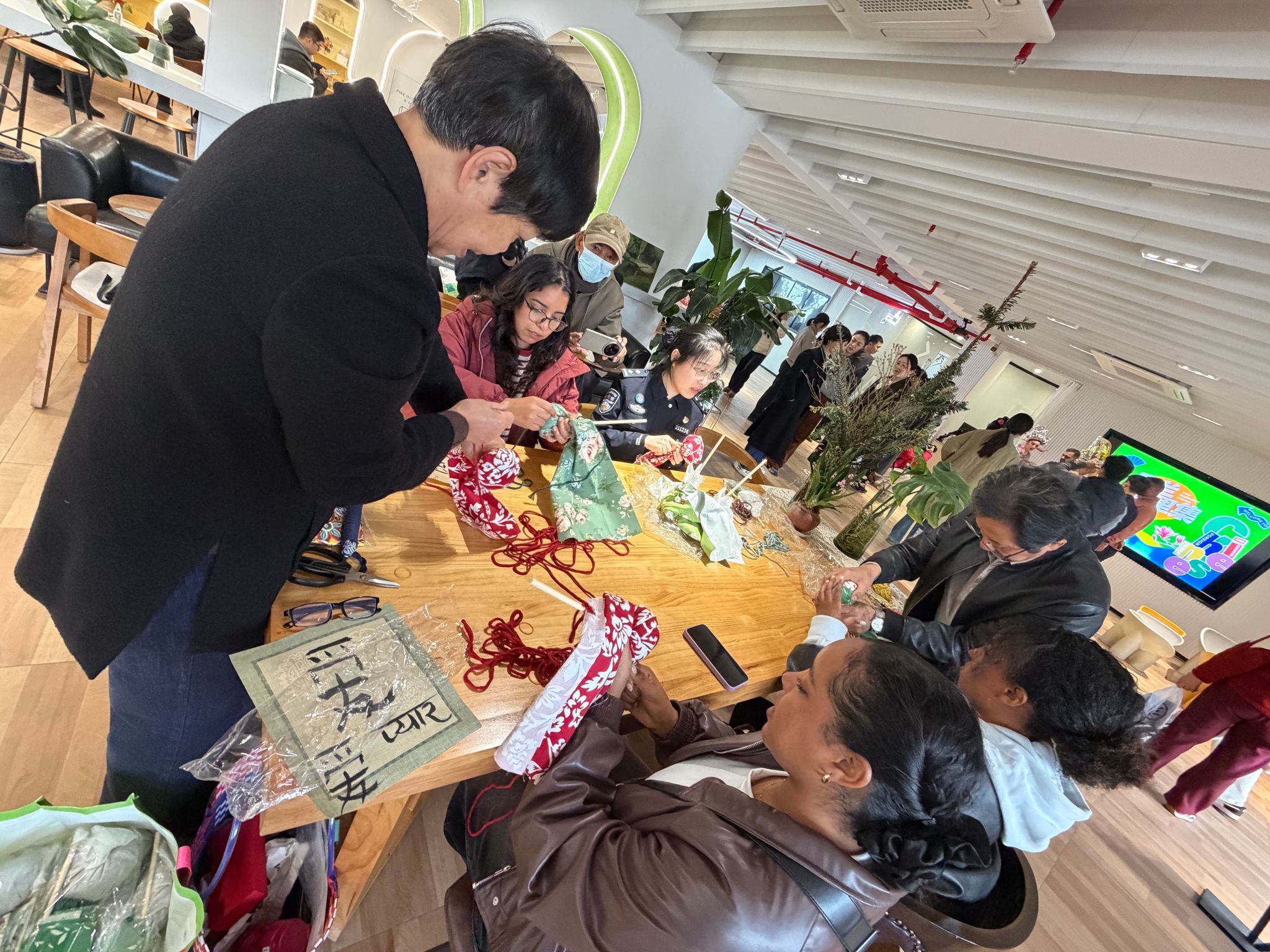 在活动现场,留学生们表现出浓厚的兴趣与热情。在书法体验区,他们在指导下执笔挥毫,从一横一竖中初探翰墨艺术的博大精深;于艾草锤制作台前,大家亲手缝制、填充,了解中医养生智慧在日常生活中的应用;剪纸环节中,红纸在巧手翻飞间变幻出各样图案,展现民间艺术的精巧趣味;越剧表演部分则让留学生们领略了中国传统戏曲的婉转风雅。整个过程中,留学生们认真聆听讲解,积极动手尝试,并与社区志愿者热烈交流,现场气氛温馨而活跃。