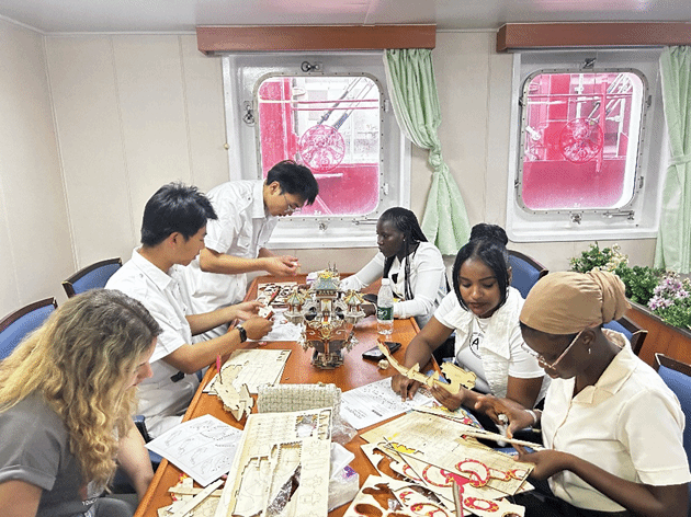 与此同时,另一组国际学生在中国学生的协助下,耐心地拼装龙舟模型。大家对照说明书,一步步拼凑出龙舟的形态,最终完成了这一传统工艺的再现。活动结束后,国际学生们与海员们共同分享了亲手制作的粽子,并将自己拼制的“龙舟”模型作为礼物赠送给了船长,表达了对中国文化的敬意和对海员们辛勤工作的感谢。
